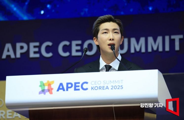 그룹 BTS의 RM(김남준)이 29일 경북 경주예술의전당에서 열린 아시아태평양경제협력체(APEC) 정상회의 최고경영자(CEO) 서밋(Summit)에 참석해 'APEC 지역 내 문화산업과 K-컬쳐 소프트파워'를 주제로 연설하고 있다. 2025.10.29 강진형 기자