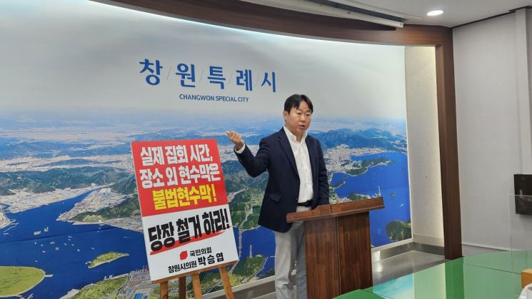 이 개정안을 대표 발의한 국민의힘 박승엽 시의원은 30일 창원시청 프레스센터에서 기자회견을 열고 "창원시는 실제 집회 또는 시위가 이뤄지는 시간과 장소가 아닐 때도 걸려있는 현수막을 즉시 철거하라"라고 촉구했다.
