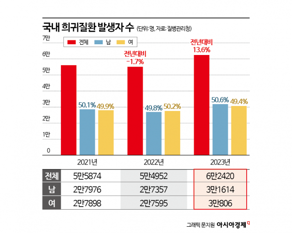31일 질병관리청이 공개한 '희귀질환자 통계 연보'에 따르면, 2023년 희귀질환 신규 발생자는 6만2420명으로 전년 대비 7468명 증가했다. 이는 '다낭성 신장, 보통염색체우성(4830명)', '특발성 비특이성 간질성 폐렴(313명)' 등 42개 질환이 국가관리대상 희귀질환으로 새로 지정된 영향으로 분석된다.