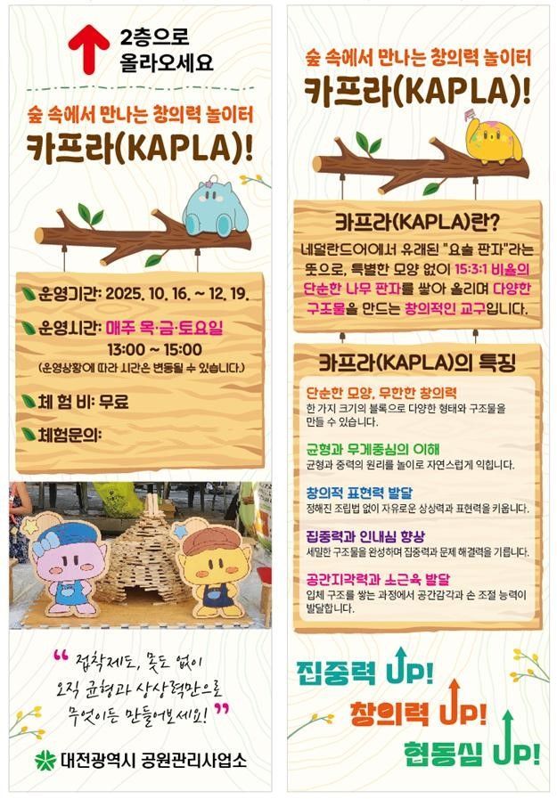 '카프라(KAPLA) 체험'은 10월부터 12월까지 매주 목·금·토요일 오후 1시부터 3시까지 운영되며, 참여를 원하는 시민은 운영 기간 중 보문산 행복 숲길 지원센터(2층 교육실)로 방문하면 참여할 수 있다.