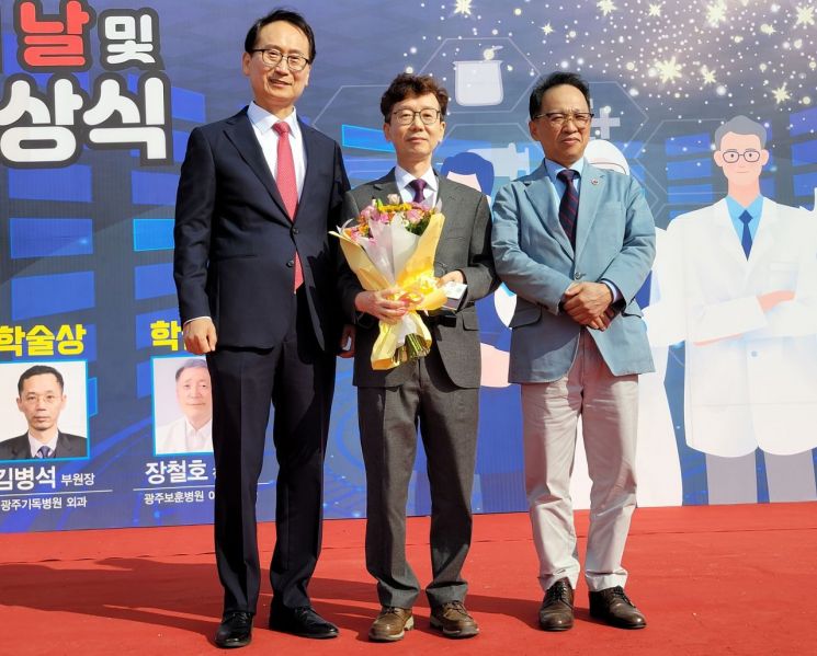조선대병원 마취통증의학과 임경준 교수(가운데)가 26일 조선대학교부속중학교 운동장에서 열린 제31회 광주 의사의 날 및 무등의림상 시상식에서 '무등의림상' 학술상을 수상했다. 조선대병원 제공