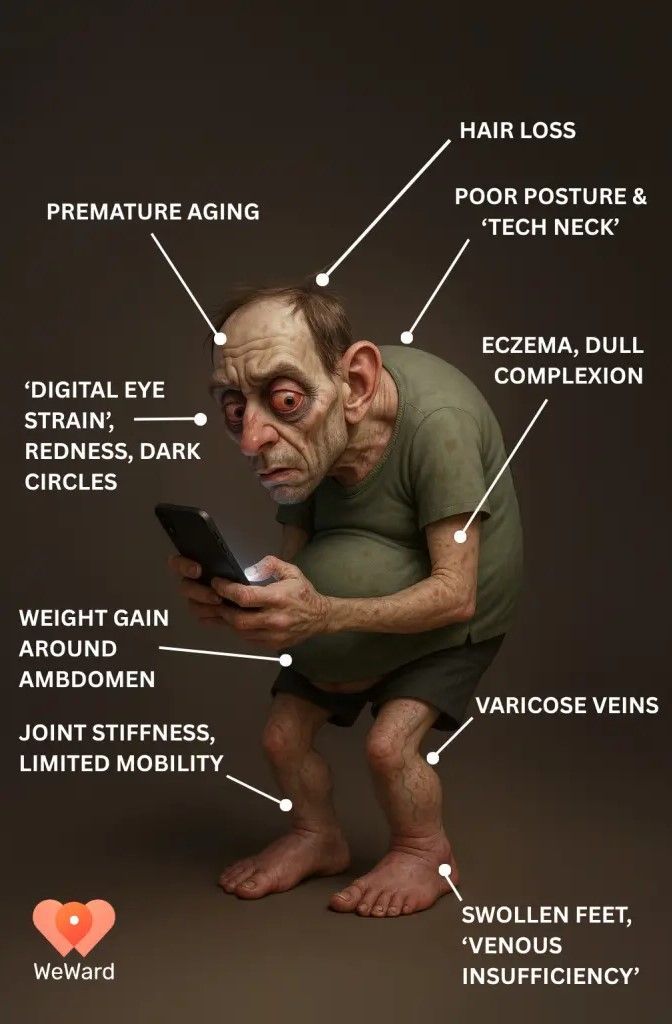 샘은 오랜 좌식 생활과 과도한 스마트폰 사용으로 소모되지 않은 에너지가 지방으로 전환돼 복부에 쌓이면서 체중이 늘고 복부 비만이 생겼다. 더구나 시간이 지나면 심장병과 당뇨병 발병 위험까지 커진다. 또 장시간 앉아 있거나 화면을 보면서 구부정하게 앉아 있었기 때문에 머리는 앞으로 기울어지고 상체는 굽은 데다 거북목으로 변했다. 이는 종종 만성적인 어깨와 목 통증으로 이어진다.