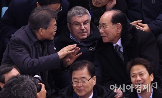 문재인 대통령(왼쪽부터)과 김영남 북한 최고인민회의 상임위원장(오른쪽)이 2018년 평창동계올림픽 당시 강원도 강릉 관동하키센터에서 열린 여자 아이스하키 B조 조별리그 1차전 남북 단일팀과 스위스의 경기를 관람 중 대화하고 있다. 가운데는 토마스 바흐 IOC위원장. /강릉=김현민 기자 kimhyun81@