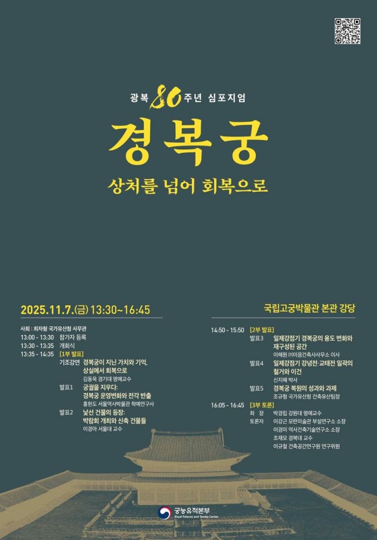 국가유산청 궁능유적본부는 광복 80주년을 맞아 오는 7일 서울 종로구 국립고궁박물관 본관 강당에서 '광복 80주년 경복궁, 상처를 넘어 회복으로' 학술토론회를 개최한다고 5일 밝혔다.