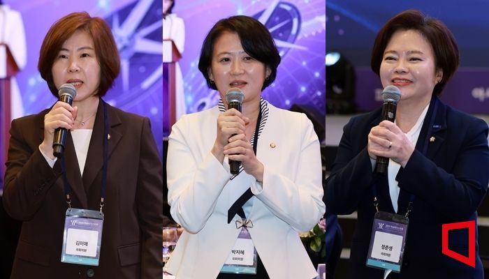 김미애 국민의힘 의원, 박지혜 더불어민주당 의원, 정춘생 조국혁신당 의원(왼쪽부터)이 6일 서울 중구 롯데호텔에서 아시아경제 주최로 열린 '2025 여성리더스포럼'에서 축사를 하고 있다. 김현민 기자