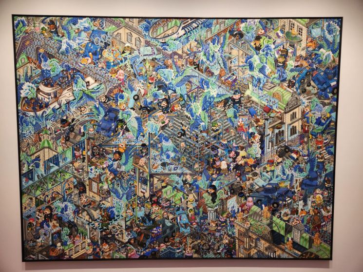 전시장 2층 정면에 걸린 대형 작품 'The Blue 2024'(165x215㎝)는 두 가지 색을 섞는 실험의 효시가 된 작품이다. 유럽의 유명 박물관을 연상케 하는 배경과 설정들, 전복된 자동차들은 유럽을 향해 우리가 지니는 막연한 사대주의를 꼬집는다.