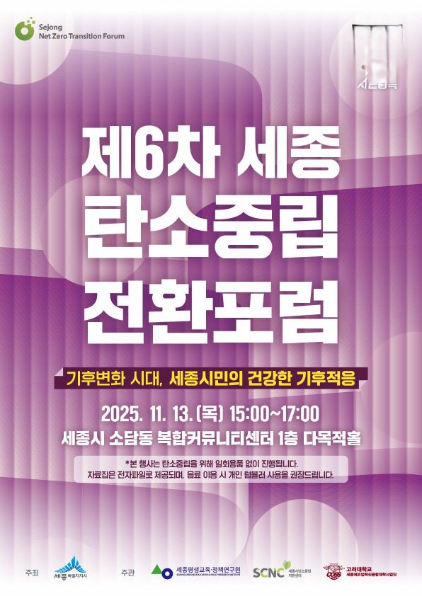 세종시가 오는 13일 소담동 행복누림터 다목적 홀에서 '제6차 세종 탄소 중립 전환포럼'을 개최한다.