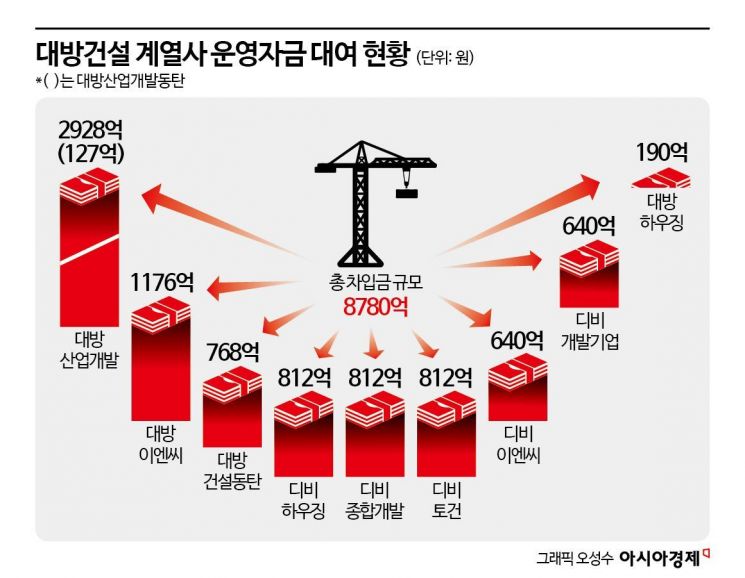 대방이엔씨(1176억원), 대방건설동탄(768억원), 디비하우징·디비종합개발·디비토건(812억원), 디비이엔씨·디비개발기업(640억원), 대방하우징(190억원) 등도 모회사로부터 자금을 차입했다. 대방 그룹은 구 회장의 아들과 사위가 지분을 소유한 대방건설과 대방산업개발이 주요 축이다. 주축으로 두개의 회사가 각각 23곳, 11곳의 자회사를 소유한 형태로 이뤄져 있다.