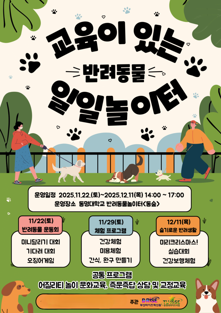 동명대학교(총장 이상천) 반려동물대학은 반려인과 반려동물이 함께 참여할 수 있는 체험형 프로그램 '교육이 있는 반려동물 일일놀이터'를 오는 11월 22일부터 12월 11일까지 총 3회에 걸쳐 교내 반려견놀이터 '동숲'에서 운영한다.