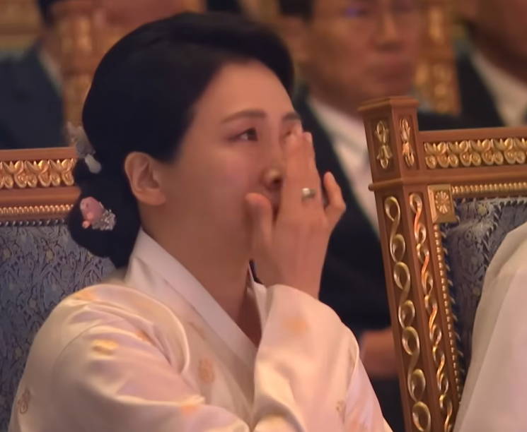 이 대통령은 눈을 감고 노래에 집중했고, 김 여사는 곡의 절정에서 끝내 눈물을 흘렸다. 김 여사는 감정이 북받친 듯 흐르는 눈물을 손으로 닦아냈다. 옆자리에 있던 현지 인사가 김 여사에게 휴지를 건네는 모습도 포착됐다. 공연이 끝나자 김 여사는 뜨거운 박수와 함께 환호를 보냈다.