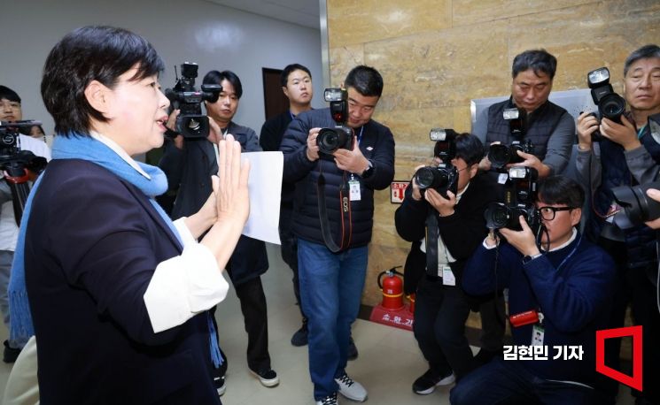 서영교 더불어민주당 의원이 19일 국회에서 취재진들에게 쿠팡 출신 인사와의 오찬과 관련 입장을 말하고 있다. 서 의원은 이날 법사위 법안심사 도중 취재진 앞에 나와 "담당 직능단체 대한변협과 만났고, 쿠팡 관계자와 만나지 않았다"며 "마치 쿠팡 관계자와 의도적으로 만난 것처럼 쓰여진 문자 관련해서는 법적 조치를 검토하겠다"고 말했다.
