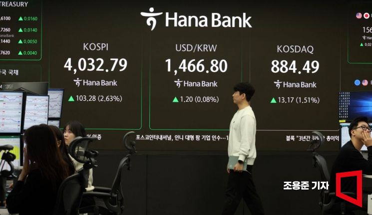 코스피가 3% 가까이 상승 출발하며 4000선을 회복한 20일 서울 중구 하나은행 딜링룸 현황판에 코스피, 원/달러 환율, 코스닥지수 등이 표시돼 있다. 이날 코스피는 전장 보다 2.58% 오른 4030.97로 코스닥도 1.71% 상승한 886.23 시작했다. 2025. 11.17 조용준 기자