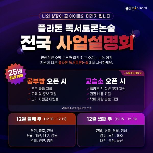 한편, 플라톤 독서토론논술은 '교사(원장)의 성장이 곧 아이들의 미래가 된다'는 철학을 바탕으로 독서·토론·글쓰기를 연계한 학습 구조를 구축해 온 교육 브랜드다. 차별화된 독서토론논술 콘텐츠와 안정적인 수업 운영 체계, 창업 초기 운영을 지원하는 제도를 기반으로 24년간 교육 현장에서 신뢰를 쌓아왔으며, 이를 토대로 예비 원장에게 지속 가능한 교육 창업 모델을 제시하고 있다.