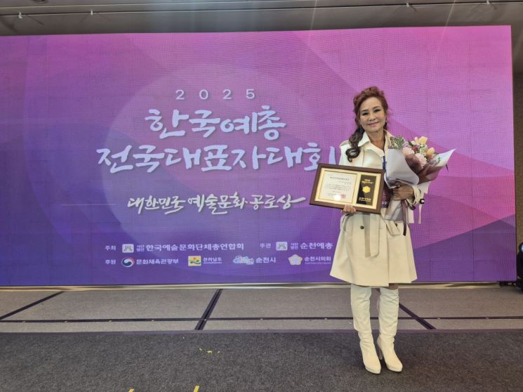 지난 20일 전남 순천 에코그라드호텔에서 열린 2025대한민국 예술문화상 시상식에서 (사)대구예총 회원이며 지역 가수로 명성을 얻고 있는 정주리 대구연예예술인협회 동대구지회 회장이 영예의 공로상을 받았다.