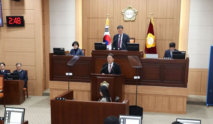 홍태용 경남 김해시장이 21일 열린 제275회 김해시의회 제2차 정례회에서 시정연설을 통해 내년도 시정 운영 방향과 예산안을 발표했다.
