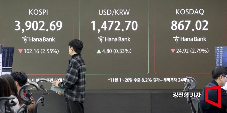 코스피 지수가 장 직후 4% 넘게 하락하며 하루 만에 4000선이 무너진 21일 서울 중구 하나은행 딜링룸 전광판에 국내 주가지수가 표시돼 있다. 이날 원달러 환율은 4.5원 오른 1472.4원에 개장했다. 2025.11.21 강진형 기자