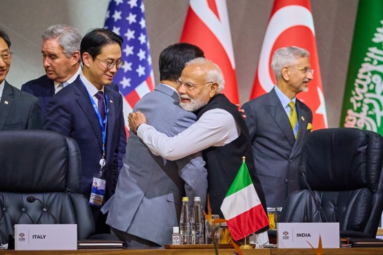이재명 대통령이 22일(현지시각) 주요 20개국(G20) 정상회의가 진행 중인 남아프리카공화국 요하네스버그에서 나렌드라 모디 인도 총리와 만나 양국 간 협력 필요성을 논의했다. 모디 총리는 이 대통령의 인도 방문도 요청했다.
