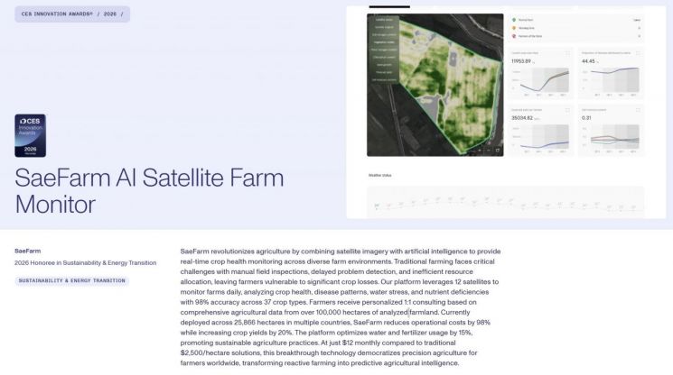 해당 기술은 내년 1월 열리는 CES 2026에서 'SaeFarm AI Satellite Farm Monitor(새팜 농림위성 인공지능 분석)' 서비스로 출품돼 공개된다.