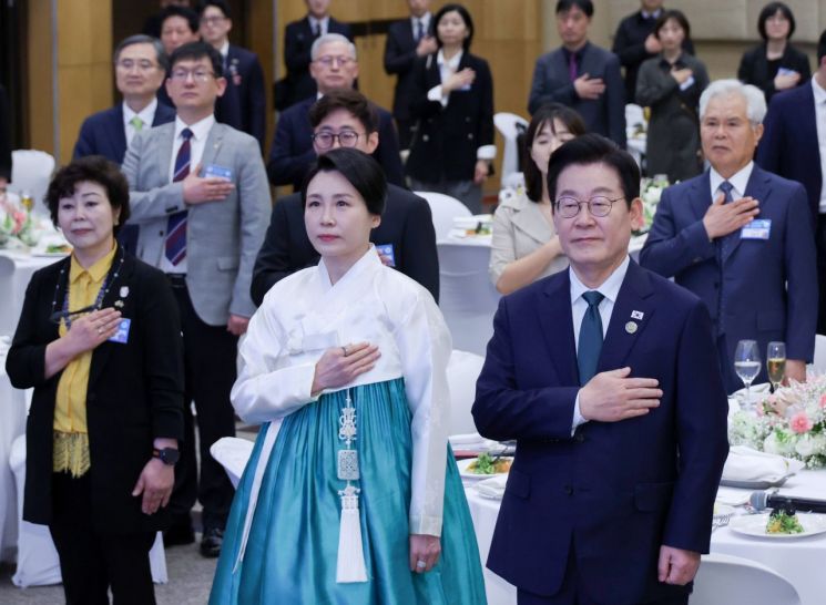 이재명 대통령과 김혜경 여사가 23일(현지시간) 남아프리카공화국 요하네스버그 샌튼 컨벤션센터에서 열린 동포 오찬간담회에서 참석자들과 국기에 경례하고 있다. 연합뉴스