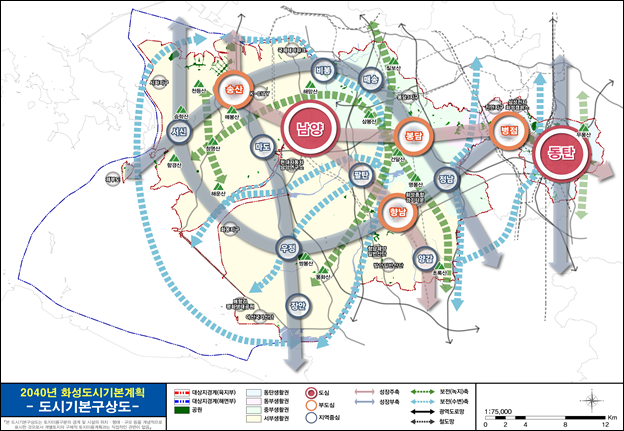 계획은 오는 2040인 계획인구를 154만명으로 설정하고, 증가하는 인구에 맞춰 도시 기능 체계는 동탄·남양 등 2도심과 병점·봉담·향남·송산의 4부도심 체계로 재편했다.
