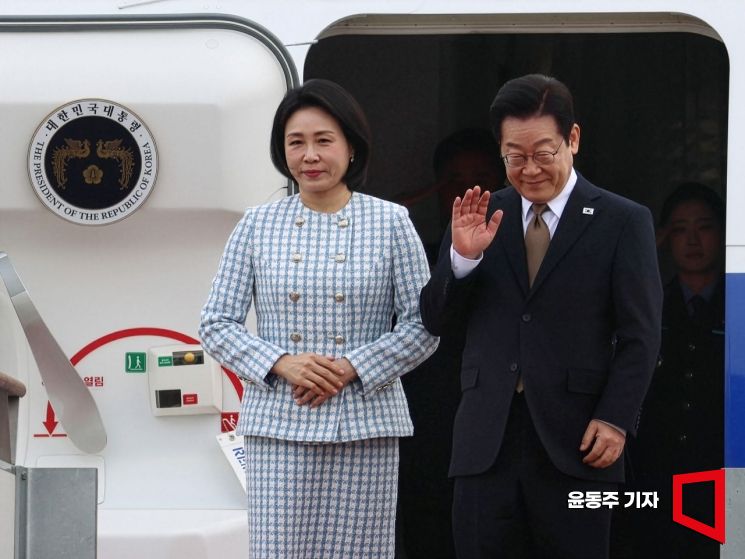 주요 20개국(G20) 정상회의 참석을 위해 중동과 아프리카 , 튀르키예 등 4개국 순방을 위해 출국하는 이재명 대통령과 김혜경 여사가 17일 경기도 성남 서울공항에서 공군1호기에 올라 환송객들에게 인사하고 있다. 2025.11.17 윤동주 기자
