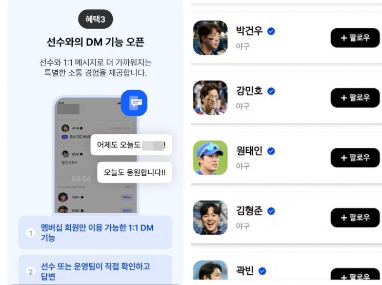 해당 애플리케이션은 야구 선수와 1대1로 채팅하고 생일 축하 영상을 받을 수 있다. 기본 이용료가 선수당 월 4500원, 생일·특별 메시지는 20만원에 달한다. 해당 앱은 이처럼 비용을 지불하면 1대1 DM(다이렉트 메시지)을 주고받을 수 있고, 선수가 직접 올리는 포스트와 미공개 사진도 볼 수 있다고 안내한다. 이미 아이돌 그룹 등에서 사용 중인 '버블' 서비스처럼 선수들과 직접 메시지를 주고받을 수 있는 것이다. 그러나 해당 서비스를 두고 일부 야구팬 사이에서는 "경기에 집중해야 하는 데 방해가 될 것 같다"며 회의적인 반응을 나온다. 이 앱 서비스에서는 박건우(NC), 원태인(삼성), 안현민(KT), 임찬규(LG) 등 리코 에이전시 소속 선수들이 참여하고 있다.