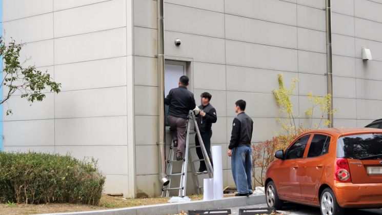 25일 오후 장애인화장실부터 작업을 시작해 1층 남녀 화장실 창문까지 모두 덮었다.