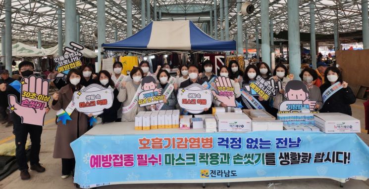 전남도와 무안군보건소 등 50여 명은 26일 무안 일로시장에서 방문객들에게 예방접종을 독려하고 마스크 등 예방물품을 나누며 현장 홍보를 벌였다. 의료기관·마트·학원 등 다중이용시설 이용 시 마스크 착용을 반드시 지켜달라고 당부했다.