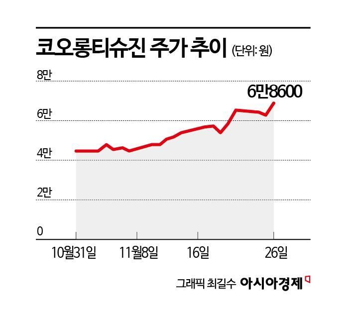 27일 금융투자업계에 따르면 코오롱티슈진은 이달 들어 53% 올랐다. 전날 장중 한때 7만원까지 오르기도 했다. 시가총액은 5조7000억원을 돌파했다. 외국인투자자와 기관투자가가 코오롱티슈진 주식을 사들이며 주가 상승을 이끌고 있다. 외국인은 이달 들어 전날까지 497억원 누적 순매수를 기록했다. 주당 평균 매수가는 5만5920원으로 평가 수익률은 22.7%를 기록했다. 같은 기간 국내 기관도 42억원어치 코오롱티슈진 주식을 사들였다.