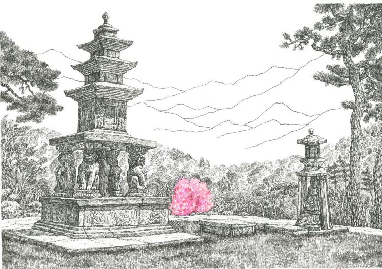마음을 잠시 멈춰 애정 어린 시선으로 바라보면, 보이지 않던 풍경조차 서서히 모습을 드러낸다. 작가는 그런 순간을 포착한다. 단순한 구조물이나 경관이 아니라, 화엄사의 결을 가장 온전히 드러내는 자리를 찾아내고, 그 자리에 머문 시선과 마음까지 그림에 담아낸다. 그곳은 풍경이기도 하고, 태도이기도 하다.
