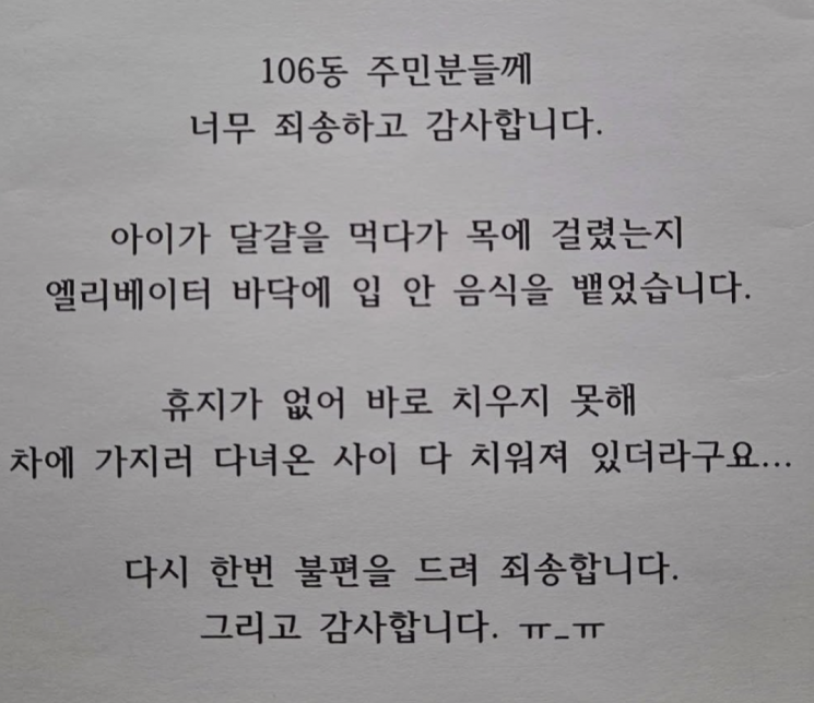 작성자는 "106동 주민분들께 너무 죄송하고 감사하다"며 "아이가 달걀을 먹다가 목에 걸렸는지 엘리베이터 바닥에 음식물을 뱉었다. 휴지 없어 바로 치우지 못했고 차에 가지러 다녀오는 사이 누군가 다 치워져 있더라"고 말했다. 이어 "다시 한번 불편을 드려 죄송하고, 감사하다"는 했다.
