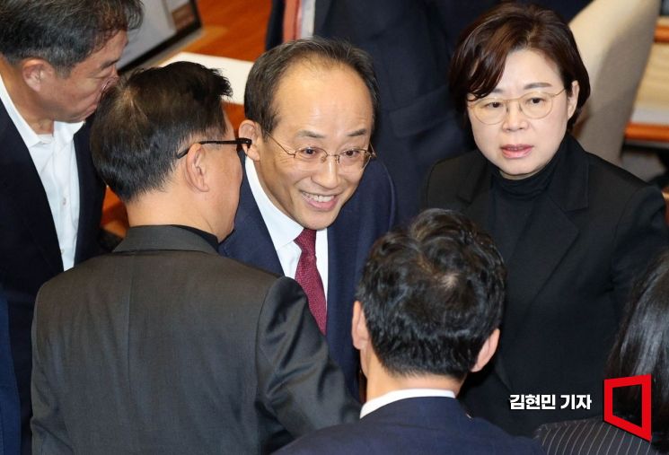 계엄 해제 의결을 방해한 혐의(내란 중요임무 종사)로 구속영장이 청구된 추경호 국민의힘 의원이 27일 국회 본회의에서 자신의 체포동의안 표결에 앞서 신상발언을 한 뒤 국민의힘 의원들과 악수하고 있다. 2025.11.27 김현민 기자