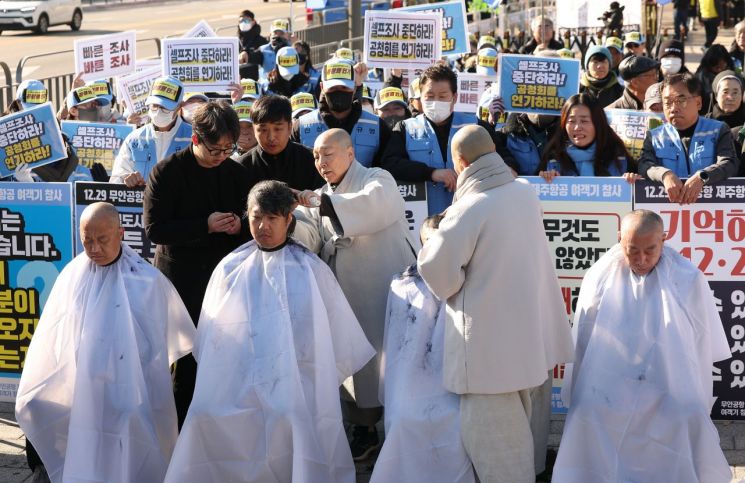 12·29 무안공항 제주항공 여객기참사 유가족협의회가 1일 서울 용산구 대통령실 앞에서 연 '공청회 및 중간발표 중단 촉구' 기자회견에서 유가족들이 삭발을 하고 있다. 연합뉴스