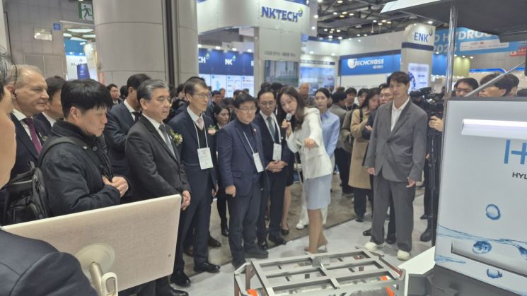 이날 김 장관은 장 부회장과 함께 현대차그룹, HD현대인프라코어, 3M, 에어리퀴드, 코오롱, 일진하이솔루스, 린데, 한국수력원자력 등 다양한 기업의 전시 부스를 둘러봤다.