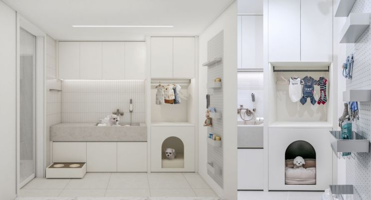 ㈜대원 '칸타빌 디 에디션'의 84㎡ A 타입에 적용되는 해당 공간은 반려동물의 목욕·드라이·발 씻김을 위한 전용 케어존으로 구성되며, 털 날림을 줄이는 구조와 배수 효율을 고려한 설계가 특징이다. 용품 수납을 한 번에 해결할 수 있는 전용 수납 구조도 제공해 반려동물의 라이프사이클에 맞춘 실질적인 편의 개선이 가능하다.