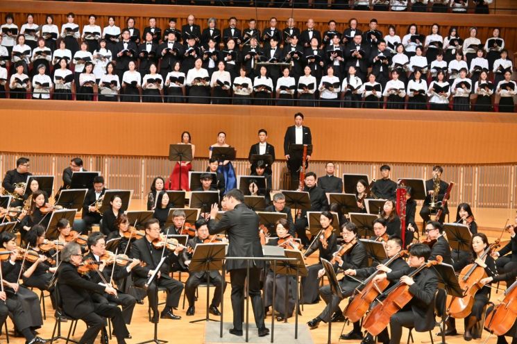 원본보기 아이콘이어진 공연에서는 최수열 인천시립교향악단 예술감독(연세대 교수)의 지휘로 코리안챔버오케스트라의 '베토벤 교향곡 제9번 합창' 합주가 펼쳐졌다. 소프라노 니시오 마이코, 메조 소프라노 타니구치 무츠미, 테너 하세훈, 바리톤 베이스 안대현 등 네 명의 한일 성악가가 무대에 함께 올라 성량을 뽐냈다. 9번 교향곡 4악장에서는 한일 양국 시민들로 구성된 100여명의 합창단이 프리드리히 실러의 시를 인용한 합창 '환희의 송가'를 다 같이 열창해 공연이 절정에 달했다.