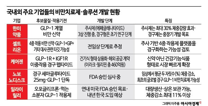 주사형 신약 개발에서는 한미약품이 가장 앞서 있다는 평가다. 한미는 장기 지속형 GLP-1 주사제 '에페글레나타이드' 3상을 진행 중이며, 중간 톱라인(결과 요약본)에서 최대 30%에 이르는 체중 감소 효과가 확인된 것으로 알려졌다. 회사는 내년 하반기 국내 출시를 목표로 허가 절차를 본격화하고 있다. 셀트리온은 4개 수용체를 동시에 자극하는 '4중 작용 비만치료제' 개발 계획을 내놓았다. 이 약 역시 먹는 비만치료제다.