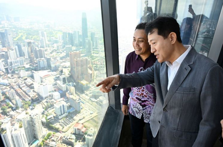 7일 세계에서 두 번째로 높은 건축물 쿠알라룸푸르 '메르데카118'을 찾은 오세훈 서울시장이 다토 이르 테스 이즈완 이브라힘 CEO와 함께 전망대에서 시내 전경을 내려다보고 있다. 서울시 제공
