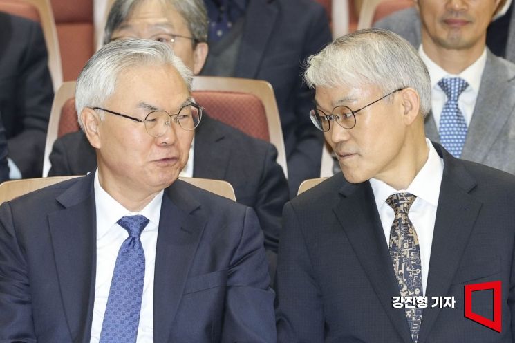 천대엽 법원행정처장과 김선수 전 대법관이 9일 서울 서초구 서울법원종합청사 청심홀에서 열린 ‘국민을 위한 사법제도 개편 공청회’에 참석해 의견을 나누고 있다.
