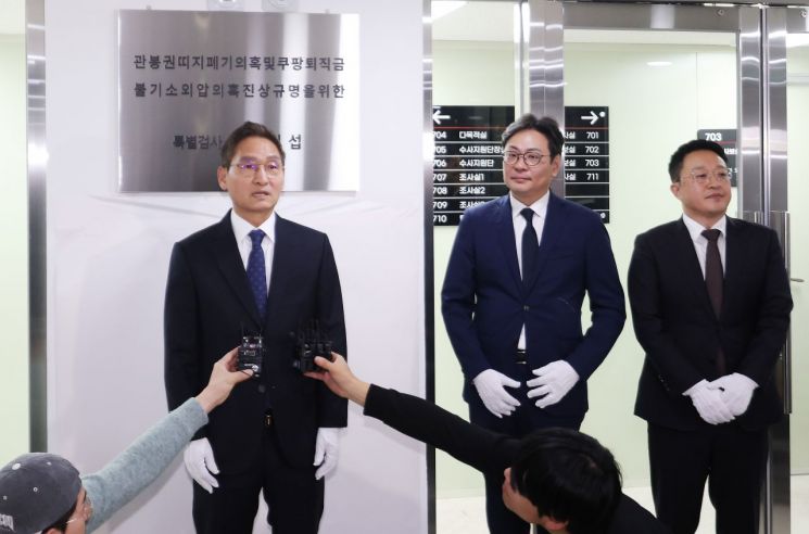관봉권 띠지 폐기 의혹'과 '쿠팡 퇴직금 불기소 외압 의혹'을 수사할 안권섭 특별검사(왼쪽)가 6일 서초구 사무실에서 열린 특검팀 현판식에서 각오를 말하고 있다. 오른쪽은 김기욱, 권도형 특검보. 연합뉴스