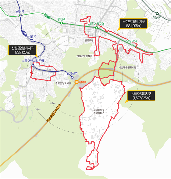 낙성대동·대학동 일대에 걸쳐 조성된 관악S밸리는 연구개발, 인공지능, 정보통신기술 분야 벤처 창업기업이 밀집한 서남권 창업생태계의 중심지다. 산업 특화지수(LQ)가 전국 평균보다 높은 4.5를 기록하며 기술 기반 산업구조를 갖췄으며, 서울대학교의 연구 역량과 청년 인재를 기반으로 ‘산학협력 창업생태계’를 확대해 나가고 있다.