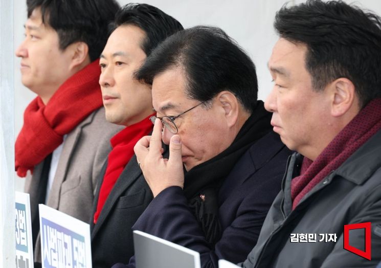 송언석 국민의힘 원내대표가 10일 국회 본청 앞에서 '더불어민주당의 8대 악법' 저지 릴레이 천막농성장에서 안경을 고쳐쓰고 있다. 국민의힘은 이른바 '8대 악법' 저지 시점까지 농성을 이어갈 방침이다. 2025.12.10 김현민 기자