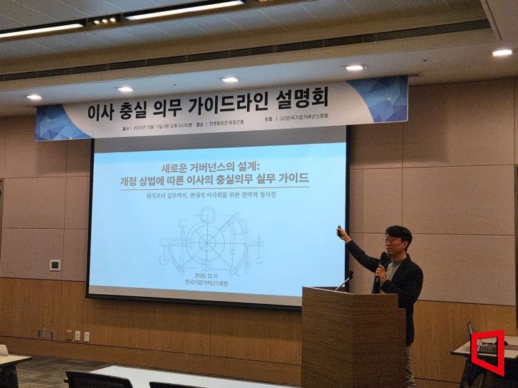 11일 한국기업거버넌스포럼은 서울 영등포구 여의도 FKI타워에서 '이사 충실 의무 가이드라인 설명회를 개최했다. 지난 7월 1차 상법 개정 이후 즉시 발효된 '이사의 주주 충실 의무 관련한 지침을 최초로 만들어 이날 공개했다.