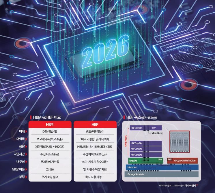 고대역폭메모리(HBM)에 집중됐던 글로벌 메모리 경쟁이 고대역폭플래시(HBF)로 옮겨갈 조짐이다. 솔리드스테이트드라이브(SSD)와 낸드플래시를 전문으로 만드는 미국 기업 '샌디스크'가 SK하이닉스와 인공지능(AI)용 HBF 표준화를 위해 힘을 합치기로 하면서 내년 하반기 시제품 출시, 내후년에 HBF를 탑재한 AI 추론용 장치 샘플을 공개하겠다는 구체적인 로드맵도 내놨다. 삼성전자, 솔브레인 등 우리 기업들도 하나둘씩 가세하고 있다.
