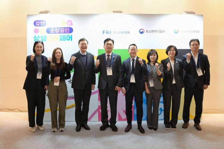 김창범 한경협 부회장(왼쪽 세번째)과 이병권 중소벤처기업부 2차관(왼쪽 네번째)을 비롯한 내빈들이 11일 동대문디자인플라자(DDP)에서 열린 '강한 소상공인 상생ON페어'에 참석해 기념촬영을 하고 있다. 이번 행사는 소상공인 역량 강화 및 디지털 전환, 글로벌 진출 등 대한민국을 대표하는 ‘K-소상공인’ 성장 기반 조성을 위해 마련되었다. 네이버·카카오·아마존·쇼피 등 주요 글로벌 플랫폼 기업이 참여해 소상공인 상생 생태계 조성을 위한 ‘성장사다리’ 역할을 수행한다. 한국경제인협회