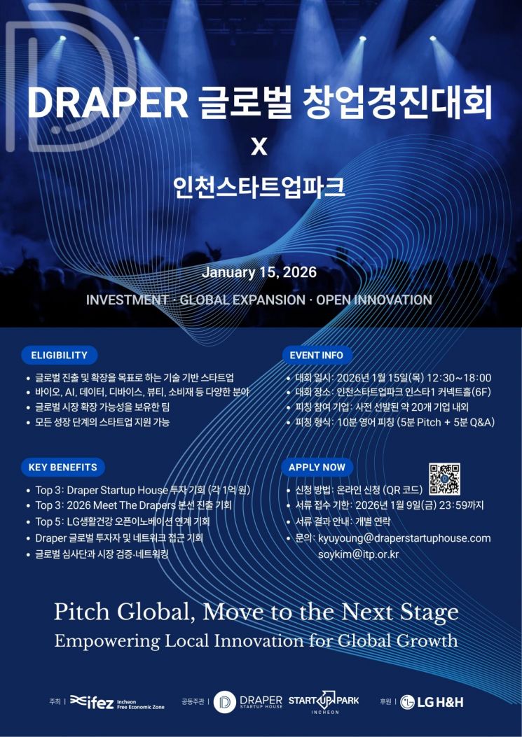이번 행사는 인천경제자유구역청의 글로벌 창업·투자 생태계 조성 전략의 일환으로 기획됐다. LG생활건강이 산업 파트너로 참여한다. 인천을 거점으로 국내 유망 스타트업을 글로벌 투자 시장과 산업 네트워크로 직접 연결하는 것이 핵심 목표다. 접수는 드레이퍼 스타트업 하우스 홈페이지에서 가능하다. 글로벌 시장 진출과 투자 유치를 목표로 하는 바이오·뷰티테크·인공지능(AI) 기반 소비재 스타트업이라면 성장 단계와 관계없이 폭넓게 지원할 수 있다.