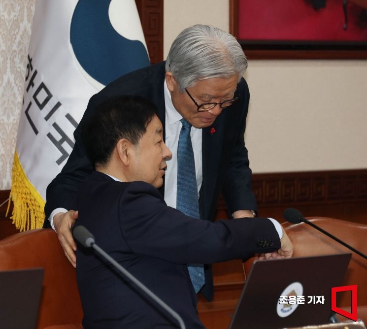 구윤철 경제부총리 겸 기획재정부 장관(왼쪽)이 31일 서울 종로구 정부서울청사에서 열린 임시국무회의에 참석, 최동석 인사혁신처장과 이야기를 나누고 있다.