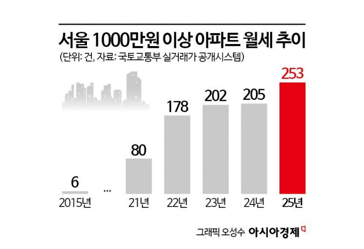 11일 국토교통부 실거래가 공개시스템 자료를 보면 지난해 서울에서 1000만원 이상 아파트 월세 거래 건수는 총 253건으로 집계됐다. 앞서 2024년 205건에 비해 23%가량 늘었다. 10년 전인 2015년만 해도 1000만원 이상 아파트 월세 거래는 6건에 불과했다. 10년 만에 42배 이상 늘어난 것이다.