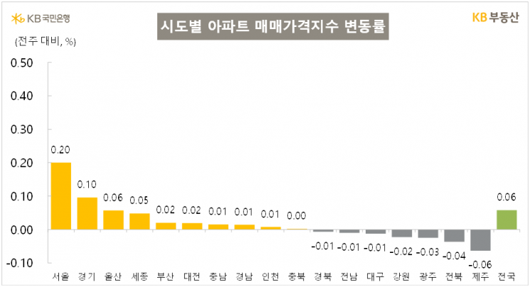 수도권(0.11%) 아파트 매매가격은 서울은 0.20%, 경기는 0.10%, 인천은 0.01% 올랐다.