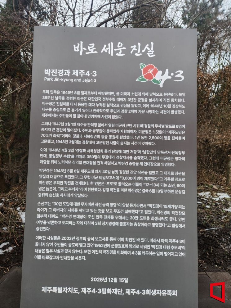 문제는 제주도가 안내판을 제작하면서 이 균형의 저울을 깨뜨렸다는 점이다. 도는 보고서에 있는 채명신 장군의 증언은 삭제하고, 오로지 살인 후 증거 인멸을 시도했던 암살범들의 일방적 주장만을 '유일한 진실'인 양 비석에 새겼다. 다른 사건에서는 그토록 철저히 지키던 '상호 존중'의 원칙이, 유독 박진경 사건 앞에서만 실종된 것이다.